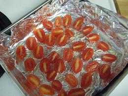 まず、小さめのミニトマトを半分に切って、オリーブ油をしいたオーブン皿の上に並べます。