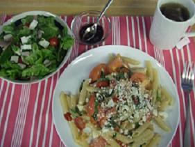 ペンネとドライトマトを足して、塩、ブラックペッパー、チーズで味を付けます。