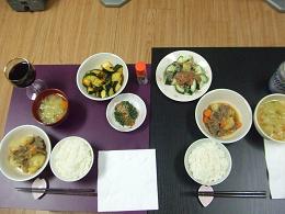 ごはん、肉じゃが、味噌汁、ほうれん草の胡麻和え、
